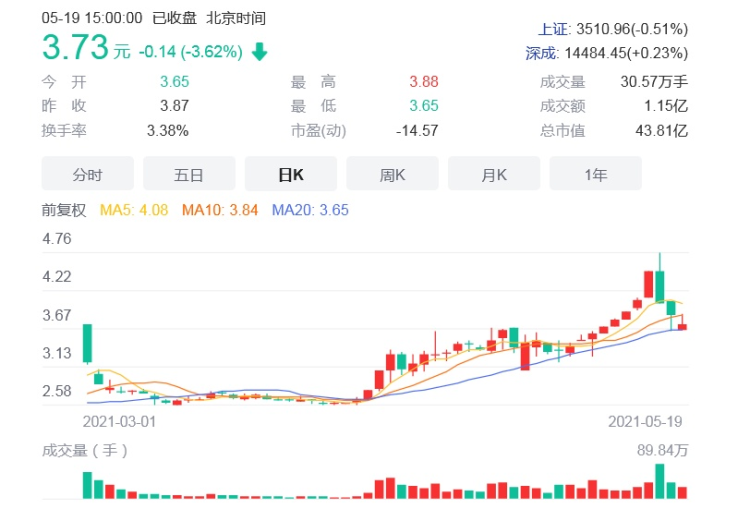 5月19日,皇庭國際收跌3.62%,報3.73元/股,這是公司連續第三個交易日大跌。而就在上周5月14日,皇庭國際股價盤中大漲5.15% ,股價創9個月以來新高。此前股價還連續7日上漲。