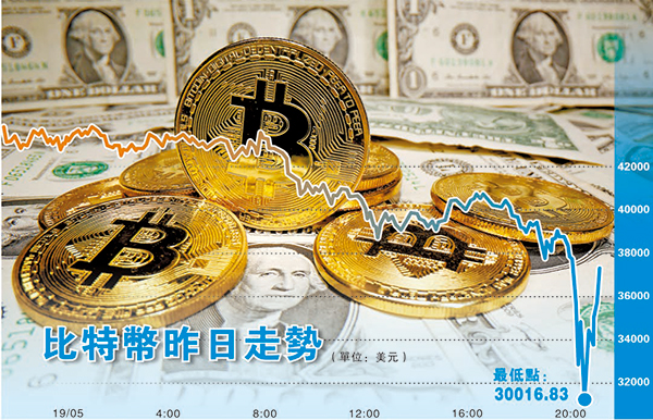 內地早前重申禁止金融機構提供加密貨幣交易相關服務,同時警告投資者勿從事相關投機交易活動後,比特幣價格昨應聲下跌,3個多月來首度摜破4萬美元(約31萬港元);昨日(19日)晚間更急跌至32000一線,24小時內跌30.7%,一度低見30016.83美元,從4月中高位腰斬逾半;其他加密貨幣亦紛紛大幅跳水。受此消息共振,投資者態度趨於謹慎觀望,美股昨夜大幅低開,道指一開市即跌400多點。