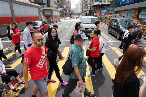 本港新冠肺炎疫情持續穩定,20日僅新增1宗輸入確診個案。圖為旺角街頭,市民戴口罩出行。 中新社