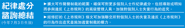 港交所(388)20日公布兩份諮詢總結,包括主板上市盈利規定,以及檢討《上市規則》有關紀律處分權力及制裁的條文。港交所擬將盈利規定調高60%,盈利調高幅度將於明年1月1日起實施,會按情況就個別申請人不用符合盈利分布授予寬限,靈活處理。有關紀律處分權力及制裁的建議,將於今年7月3日實施及生效。港交所上市主管陳翊庭相信,今次修訂會令香港資本市場整體受惠,並進一步加強香港作為亞洲首要國際金融中心的角色。