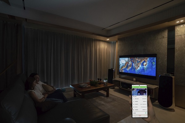 用家看電影時,只要啟動「家庭影院」場景,感應器便會把窗簾關上及燈光調暗。