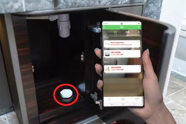 智能漏水感應器(紅圈)會即時透過手機應用程式向用戶傳送提示,貼心安心。