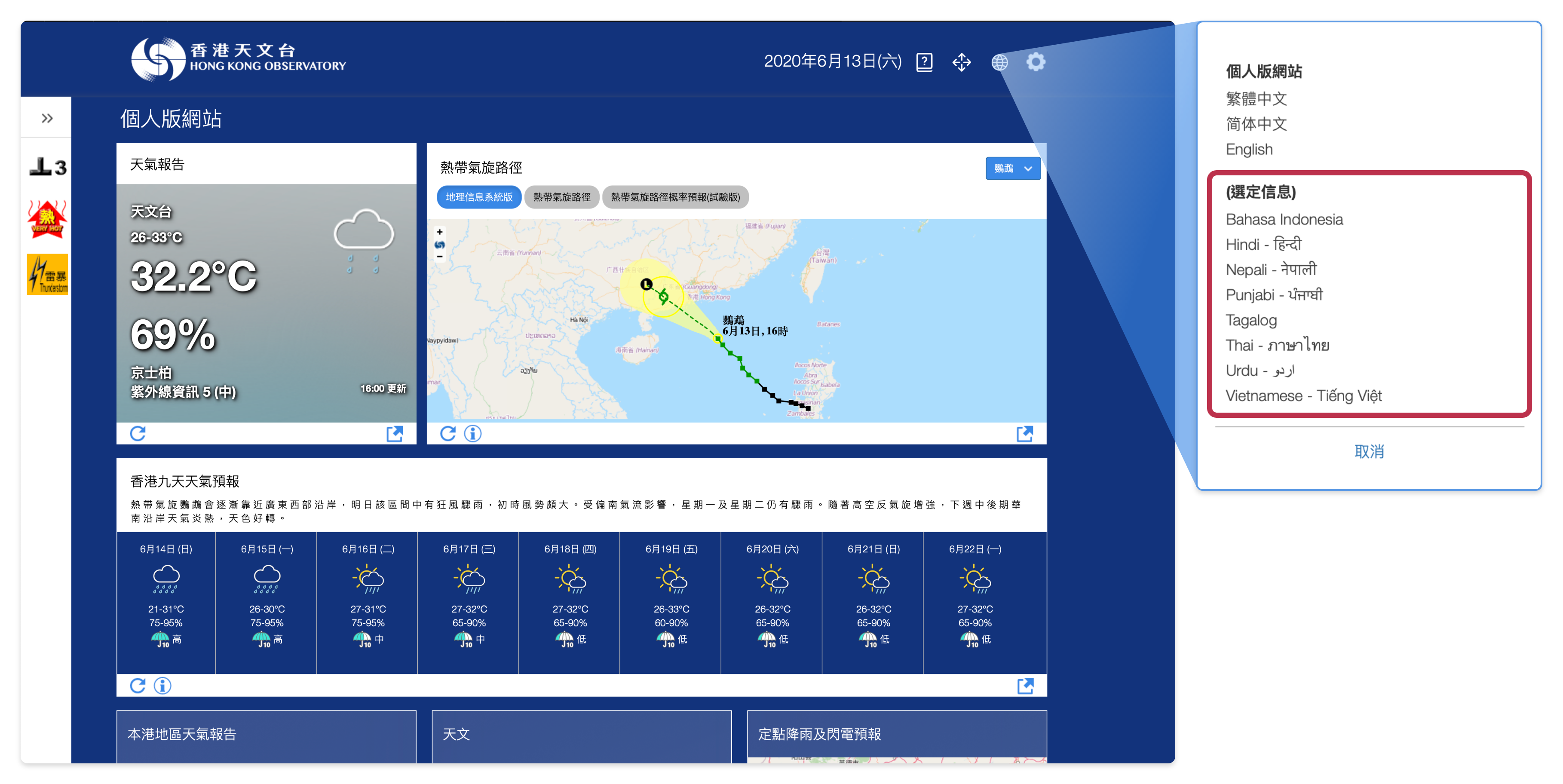 香港天文台今日(21日)宣布,推出全新個人版天氣網站,便利少數族裔人士獲得本地天氣資訊。