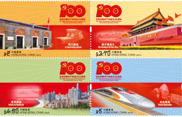率先隆重登場的是以「中國共產黨成立一百周年」為題的紀念郵票。中國共產黨於1921年7月成立,為慶祝其成立一百周年,香港郵政將以此為題,於7月1日(星期四)發行一套四枚郵票及一張郵票小型張。郵票及郵票小型張引用了中國共產黨成立一百周年慶祝活動的唯一官方指定標識,包括圖案及主題名稱引用於郵票設計內,而標識內之56根光芒線寓意中國共產黨奮進之光照耀中華大地。郵票將光芒線延伸,在紅紅的黨旗飄揚下,串連每一枚郵票,分別展示黨領導新中國的成立和發展,實現為人民謀幸福、為民族謀復興、為世界謀大同的目標。香港在中國共產黨和中央政府的領導下,成功落實「一國兩制」,香港作為特別行政區,得以維持繁榮安定,並融入國家發展的大局。