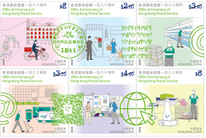 緊隨其後,於8月25日(星期三)將發行以「香港郵政服務一百八十周年」為題的紀念郵票一套六枚。郵票設計將展示香港郵政多年來的發展和演變,緊貼郵務市場的步伐,滿足顧客的不同期望和需要,創造智郵服務新時代。