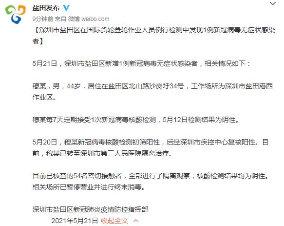 據「鹽田發布」微博消息,鹽田區新冠肺炎疫情防控指揮部通報稱,5月21日,深圳市鹽田區在國際貨輪登輪作業人員例行檢測中發現1例新冠病毒無症狀感染者,相關情況如下: