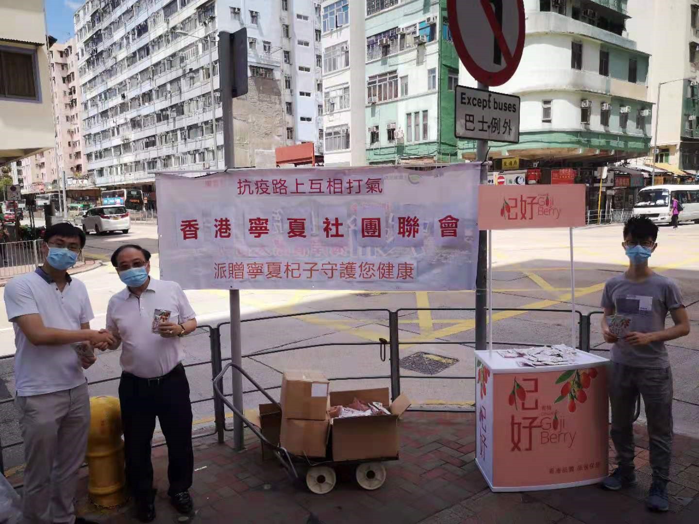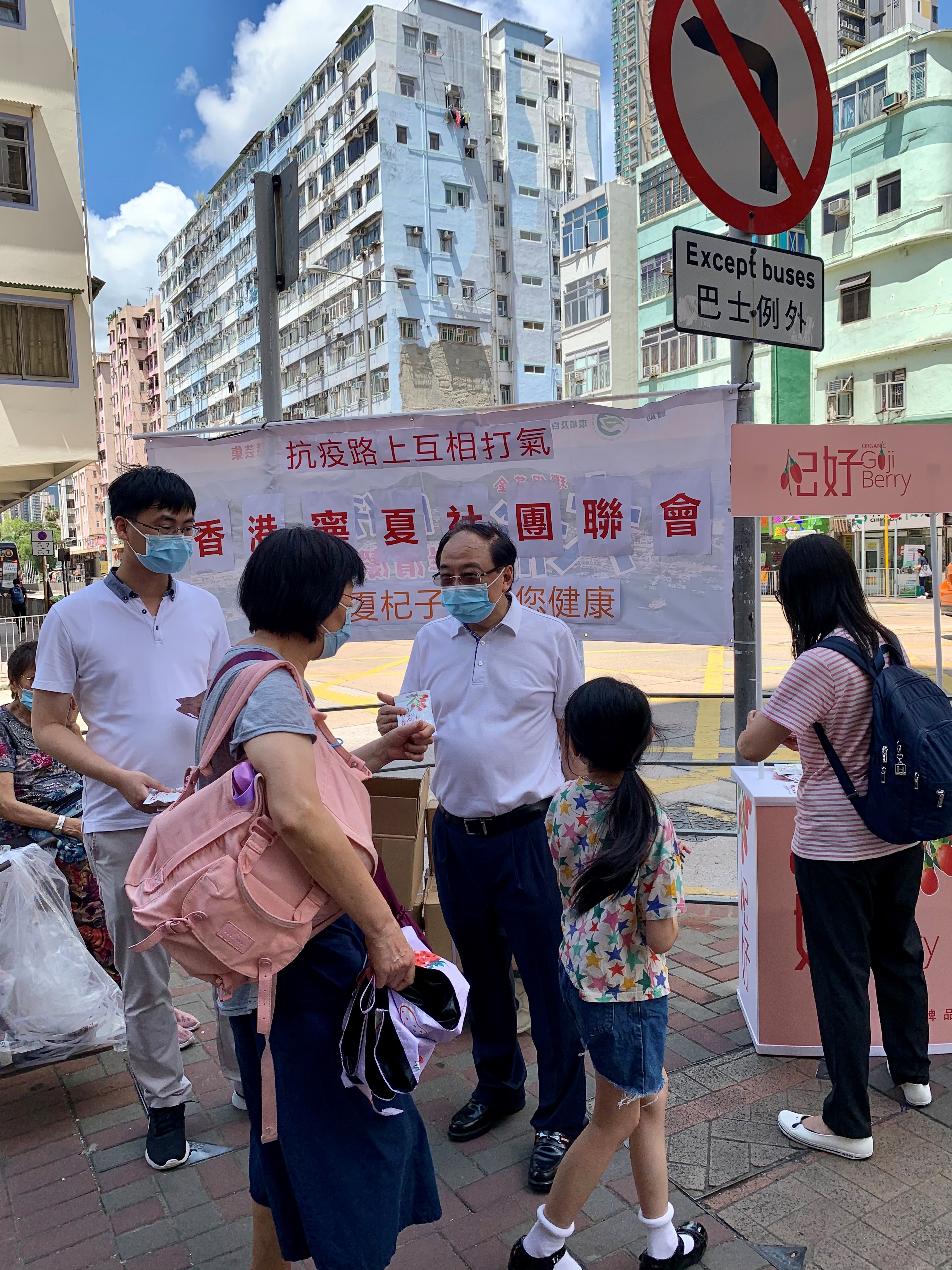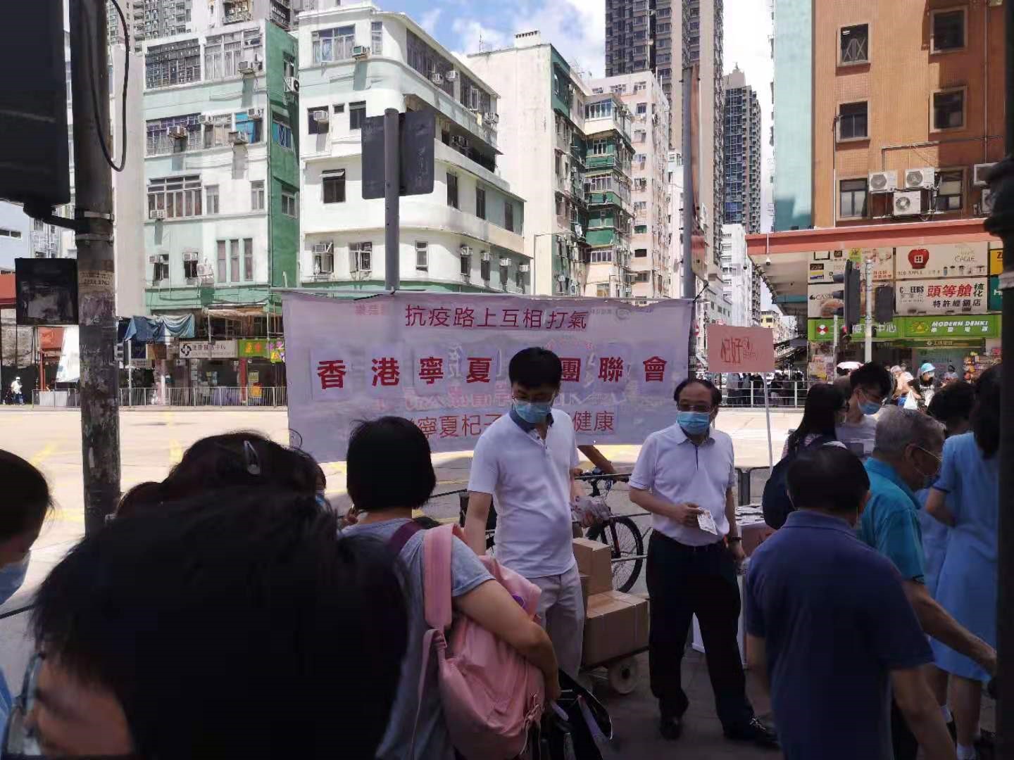 當日,馬頭圍村地區幹事邵天虹同寧夏社團聯會會長張廣勇,在35度的高溫烈日下,和眾多有心人士,齊心合力派寧夏產的杞子予街坊,與街坊在抗疫路上互相打氣,共同感受來自寧夏的心意。
