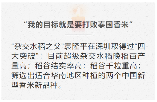 這也意味着「雜交水稻之父」袁隆平在深圳取得過「四大突破」:目前超級雜交水稻晚稻畝產量高;稻穀結實率高;稻穀千粒重高;篩選出適合華南地區種植的兩種中國新型香米新品種。