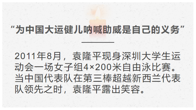 比賽結束後,袁隆平表示「為中國大運健兒吶喊助威是自己的義務。」他也曾和記者說過,看到游泳健兒奪得比薩冠軍,他會非常高興,就好像第一個衝過終點的是他自己一樣。