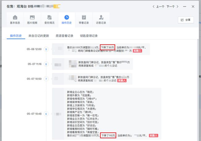 在南山,一個名為「觀海台」的樓盤房源,兩天內報價下調140萬。其中,5月7日下降110萬;5月8日,業主又下調了30萬。該樓盤位於南山區商業文化中心區,有配套名校。