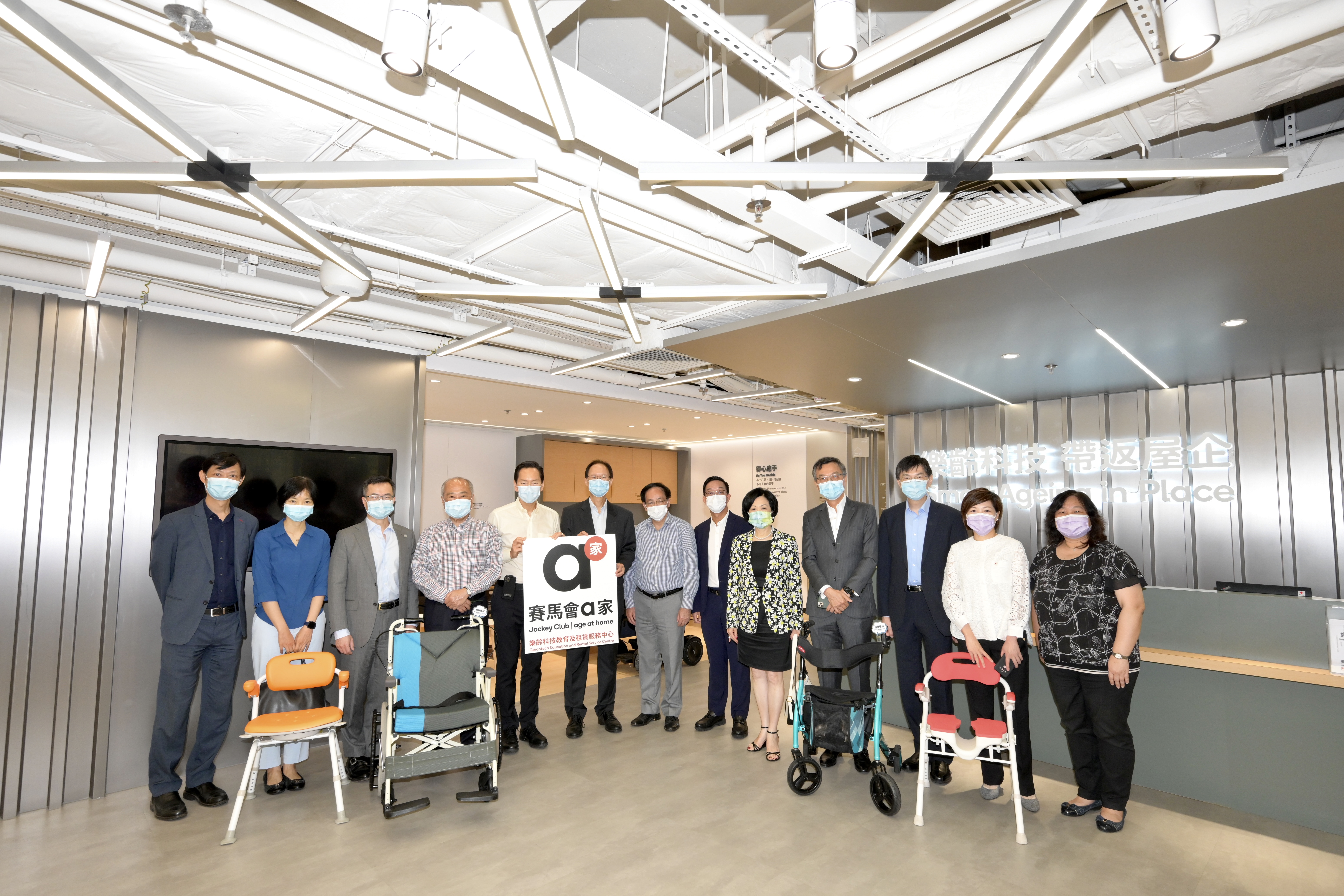 行會非官守議員召集人陳智思和非官守議員周松崗、葉國謙、葉劉淑儀、林正財和劉業強與香港賽馬會(賽馬會)董事局主席陳南祿、賽馬會慈善及社區事務執行總監張亮、香港社會服務聯會行政總裁蔡海偉、香港紅十字會行政總裁蘇婉嫻、基督教香港信義會社會服務部總幹事陳麗群、聖雅各福群會副總幹事張達昌和沙田醫院行政總監蘇詠儀在賽馬會「a家」樂齡科技教育及租貸服務中心合照。