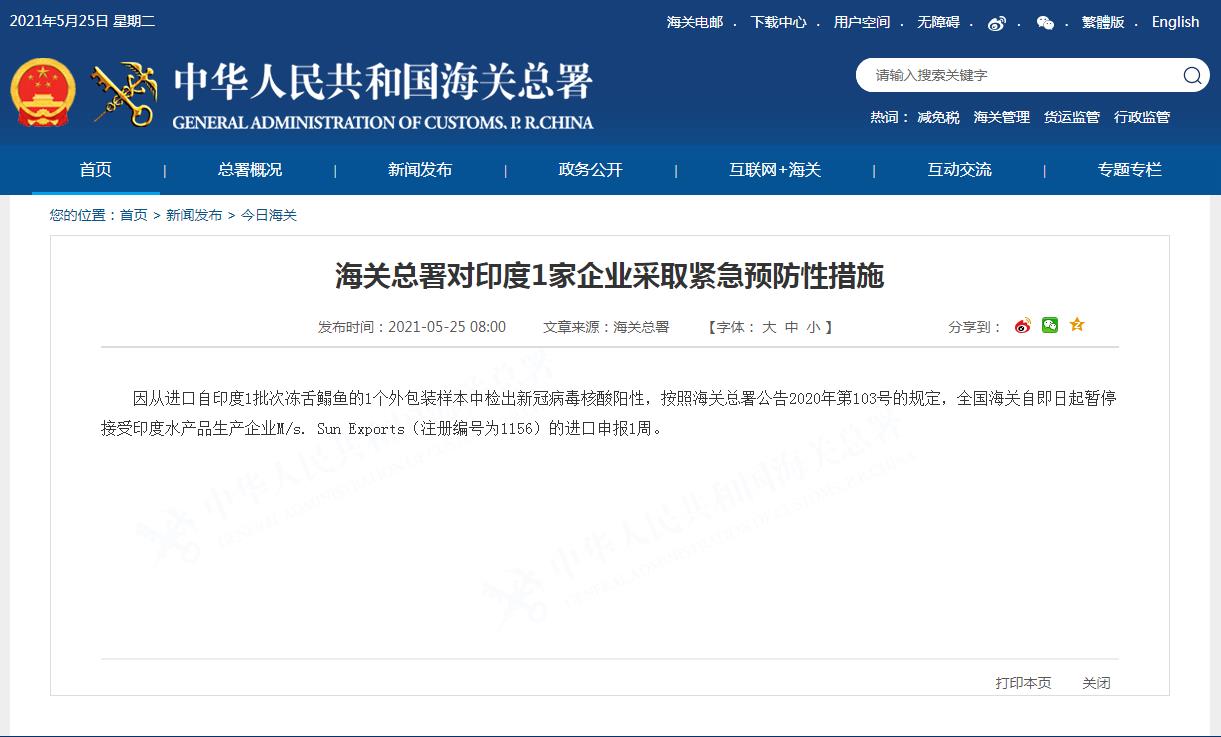 據海關總署網站消息,因從進口自印度1批次凍舌鰨魚的1個外包裝樣本中檢出新冠病毒核酸陽性,按照海關總署公告2020年第103號的規定,全國海關自即日起暫停接受印度水產品生產企業M/s. Sun Exports(注冊編號為1156)的進口申報1周。