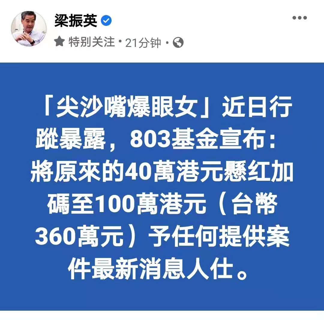全國政協副主席梁振英在社交網站宣布,尖沙咀「爆眼女」近日行蹤暴露,他牽頭成立的「803 基金」,將原來的40萬港元懸紅加碼至100萬港元,予任何提供案件最新消息人士。