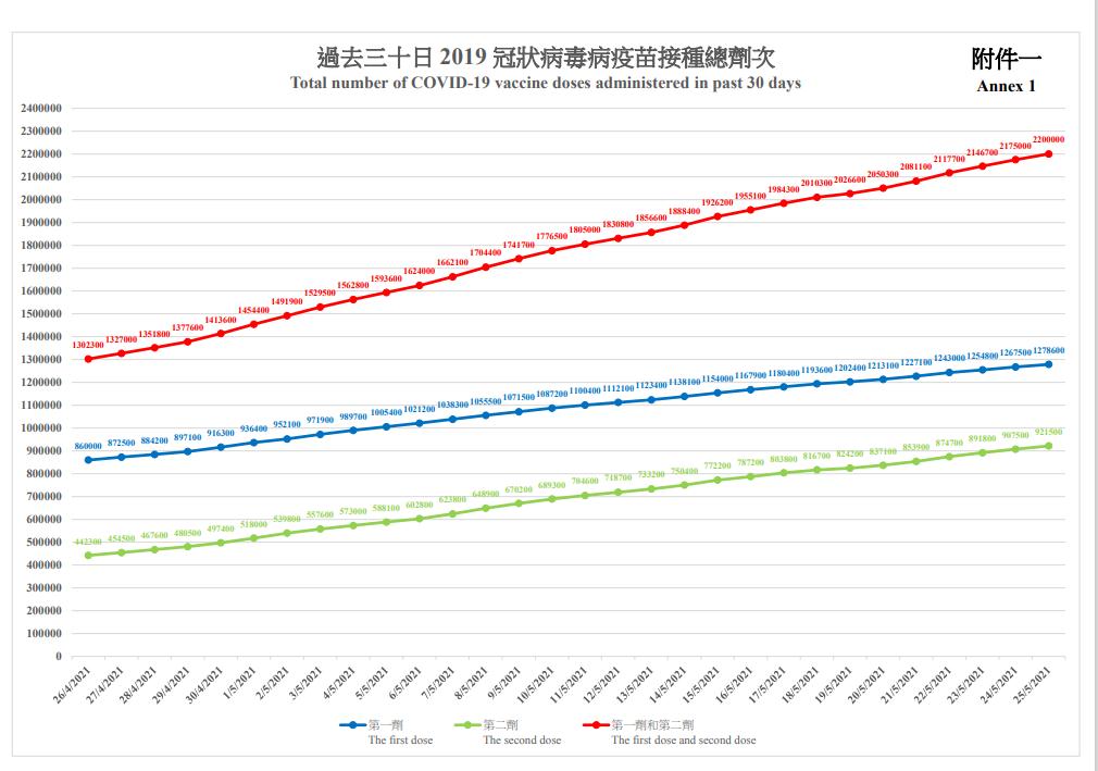 港府今晚(25日)公布,新冠疫苗接種計劃開展以來,政府已為市民接種共約2200000劑疫苗。當中約1278600名市民已接種第一劑疫苗,包括約548000名接種科興疫苗、約730600名接種復星疫苗;約921500名市民已接種第二劑疫苗,包括約405300名接種科興疫苗、約516200名接種復星疫苗。
