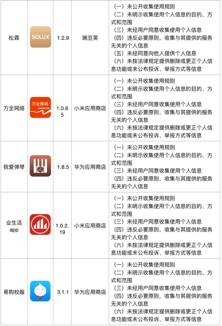 App違法違規收集使用個人信息主要分為「未公開收集使用規則」「未經用戶同意收集使用個人信息」等六大類問題。此次曝光的30款App中,均涉及「未經用戶同意收集使用個人信息」問題,具體表現為App首次啓動時,在用戶授權同意隱私政策前,就獲取用戶應用安裝列表等個人信息,或者申請打開位置、電話、存儲、錄音等權限問題;App運行時,在用戶明確拒絕位置、相機、麥克風權限申請後,仍向用戶頻繁彈窗申請開啓與當前服務場景無關的權限,影響用戶正常使用。