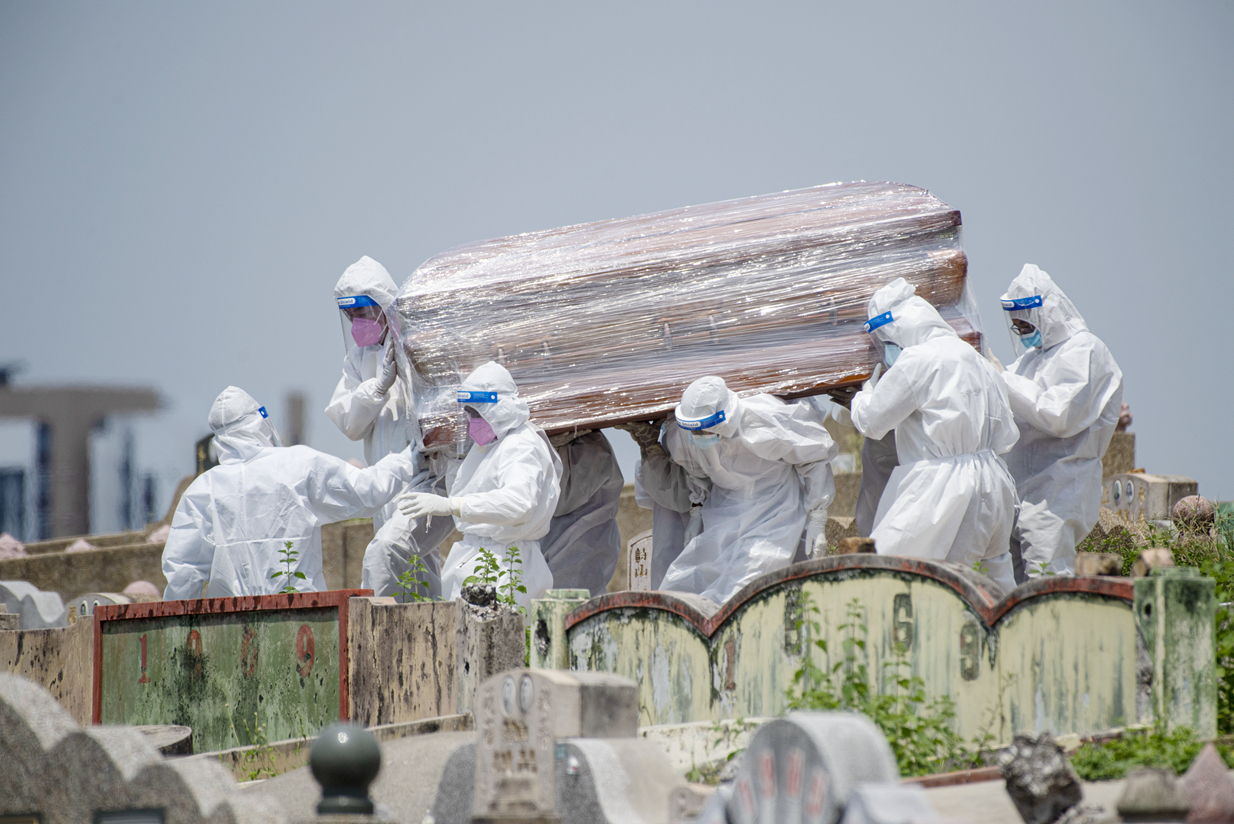 馬來西亞染疫人數激增,工作人員抬著疫歿者的棺材入墓地。 新華社