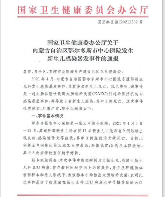 這份通知顯示,國家衛生健康委辦公廳4月25日作出《關於內蒙古自治區鄂爾多斯市中心醫院發生新生兒感染暴發事件的通報》稱: