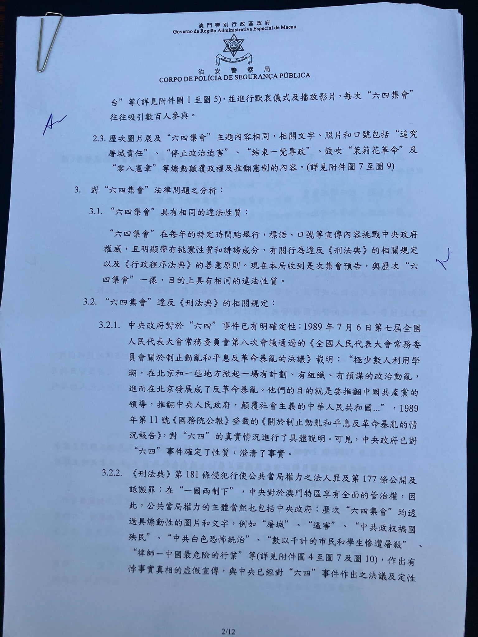 澳門警方於回覆民聯會預告的批示中指出,民聯會以往六四集會透過展示「專政倒台」、「屠城」、「中共政權禍國殃民」等圖片及文字,與中央對六四事件的定性相對立,煽動顛覆中國共產黨領導地位,違反刑法典第177條(公開及詆毀)、181條(侵犯行使公共當局權力之法人)及298條(煽動以暴力變更已確立之制度),並違反了行政程序法典的善意原則。警方認為,是次預告集會的目的,具有相同的違法性質,故此不批准有關集會。
