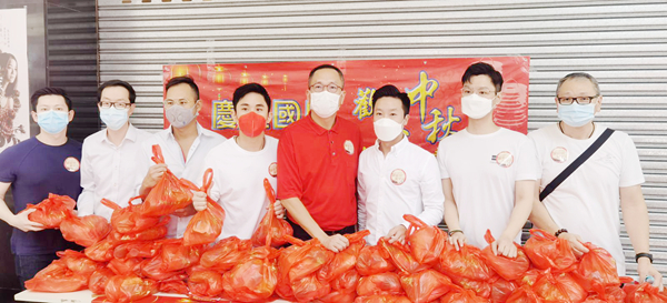 連浩民在不同的社團、慈善團體擔任職位。圖為連浩民(右二)在福建社團聯會慶中秋活動中派發裝有米、口罩及消毒用品的福袋。