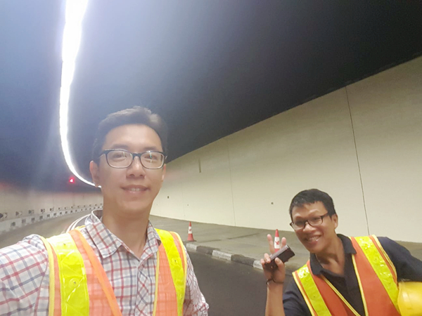 王偉超(左)和同事在香港仔隧道智慧燈控系統完工留念。