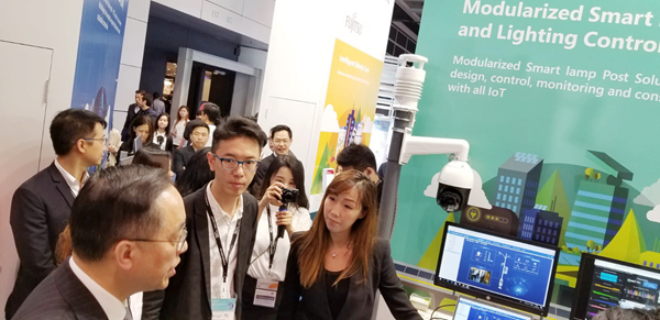 ICT Expo,王偉超(左三)為時任創科局局長楊偉雄(左二)解釋智能路燈方案。
