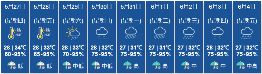 展望明日部分時間有陽光及酷熱,亦有幾陣驟雨。周末及下周初驟雨增多及有雷暴。