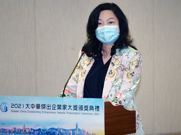 港府財經事務及庫務局常任秘書長甄美薇致辭,祝賀獲獎企業家。