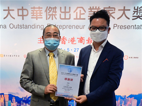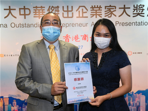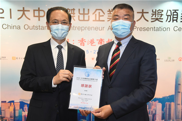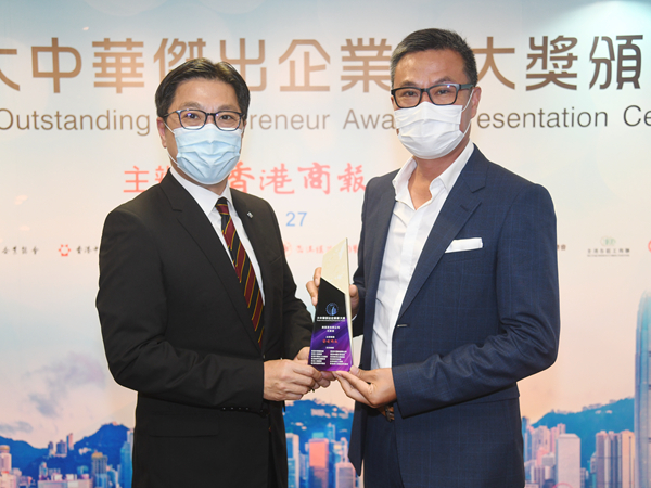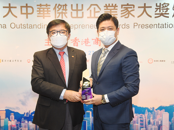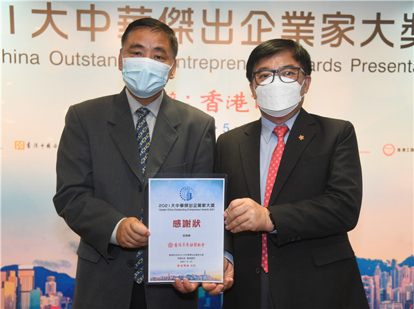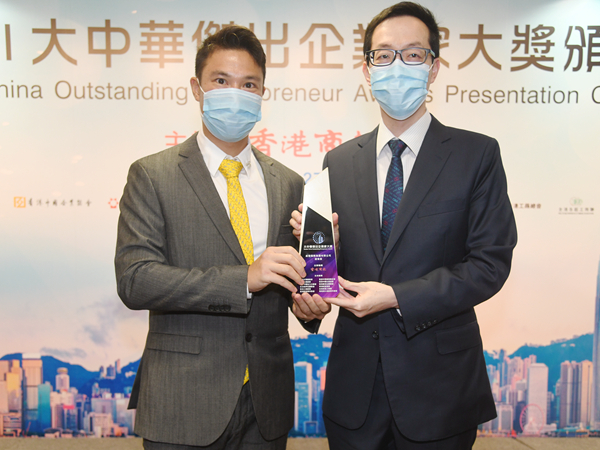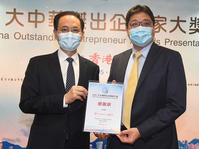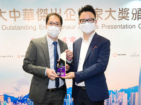 香港中國企業協會副總裁曾燊典(左)為獲獎者頒獎。