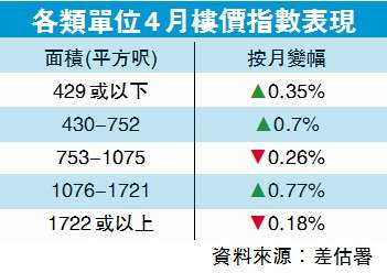 五類單位戶型呈「三升兩跌」,實用面積1076至1721平方呎的D類單位,4月份指數報327.2點,按月升0.77%,為五個類別中升幅最大。實用面積430至752平方呎的B類單位,4月份樓價指數報375.9點,按月升0.7%,升幅排第二。實用面積429平方呎以下的A類單位指數報434.8點,按月升0.35%。