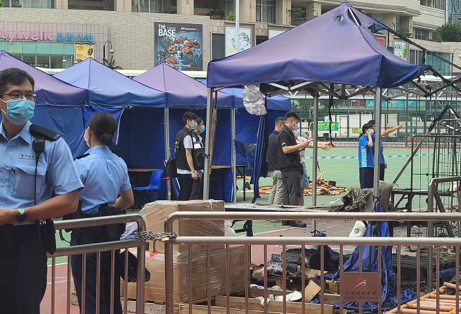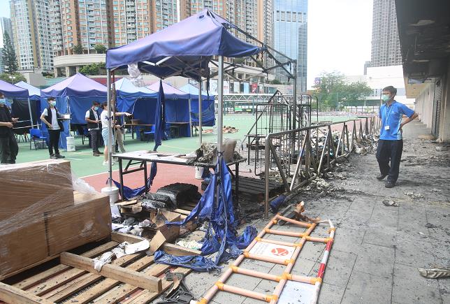 事發後,一批醫療物資,包括手套和消毒藥水等散落一地,臨時帳篷的支架燒至變形,旁邊的球場看台及洗手間牆身亦被燻黑,看台有部分的玻璃圍欄被燒至爆裂。