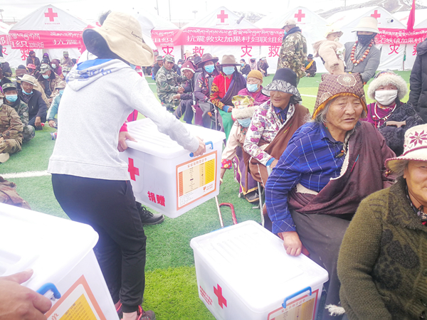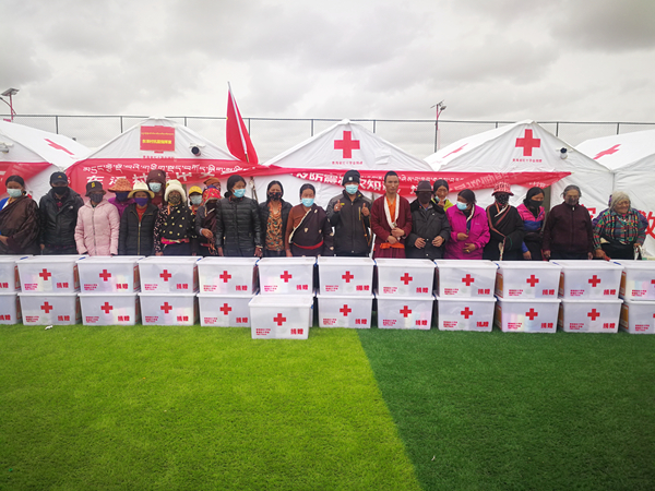 救援物資已抵達瑪多縣花石峽鎮集中安置點,並於27日完成首輪派發。圖源:青海省紅十字會