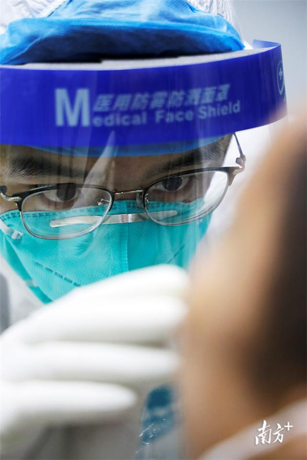 5月29日下午,南山區南頭城社區陽光雅苑核酸採樣點,醫護人員正在為居民進行核酸採樣,他們眼神里透著堅毅、認真。