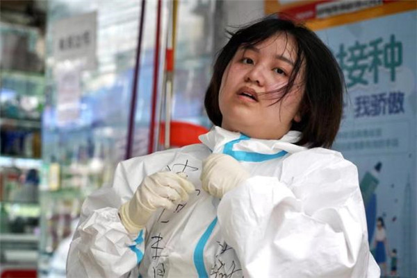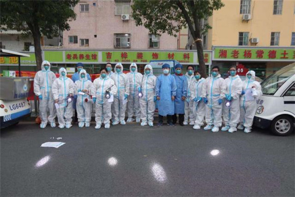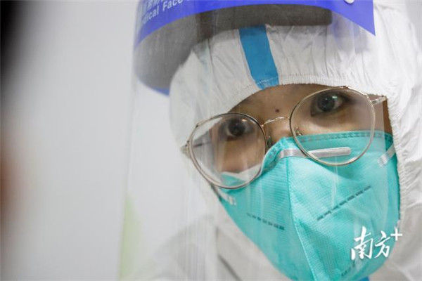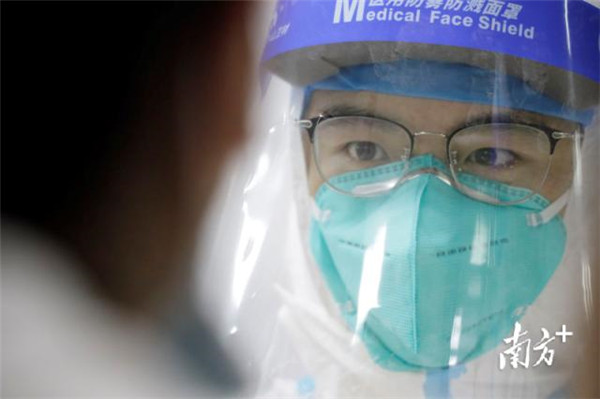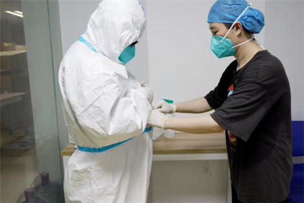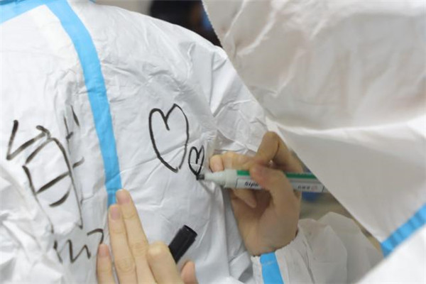 即將投入下一輪採樣工作,醫護人員在彼此的防護服上畫上愛心。
