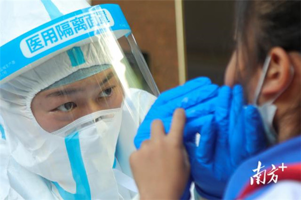 深圳市龍崗區四聯小學核酸採樣點,醫護人員給小朋友的勇敢點讚。