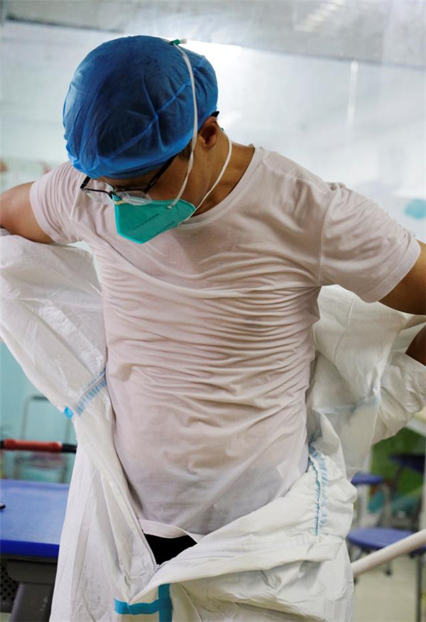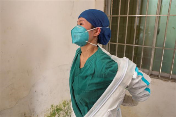 醫生自己已經無力脫下防護服了,同事相互幫忙。