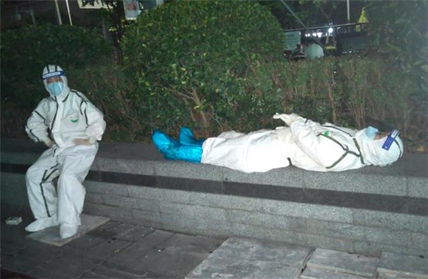採樣工作終於完成,有些醫護人員直接倒在花壇邊上休息。