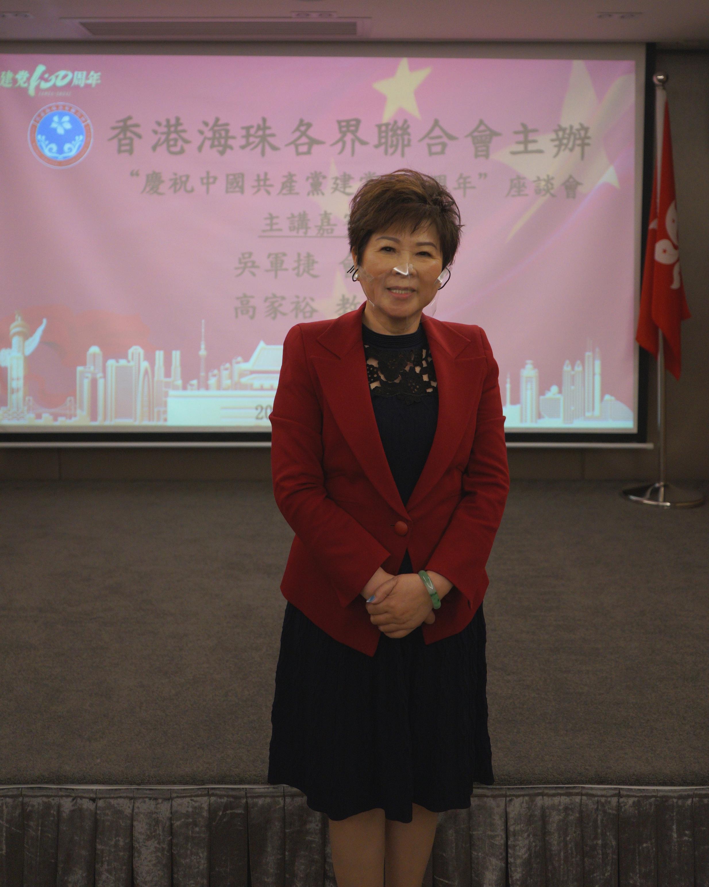 香港海珠各界聯合會日前假旺角廣州社團總會會所舉辦「慶祝中國共產黨建黨百周年」座談會,香港抗戰歷史研究會會長、海珠各界聯合會名譽會長吳軍捷和香港校董會榮譽主席、中國知識學會會長高家裕應邀出席及分享中共黨史。該會主席馮翠屏主禮致辭,並同該會常務副主席毛志成向兩位嘉賓致送感謝狀。現場座無虛席,會員們認真聆聽,共同學習黨史典故。
