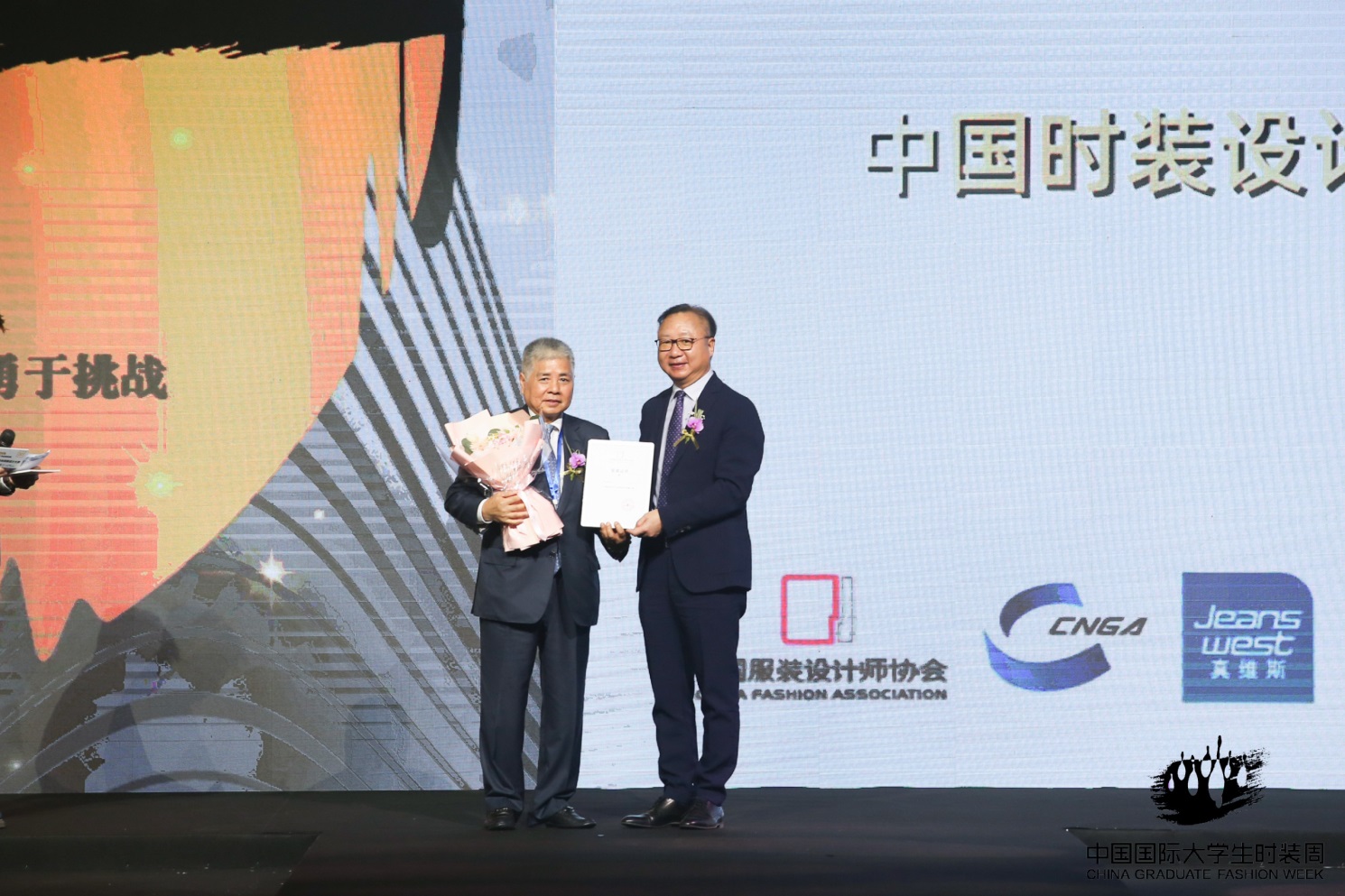 中國紡織工業聯合會會長孫瑞哲(右)為楊勳頒發榮譽證書。