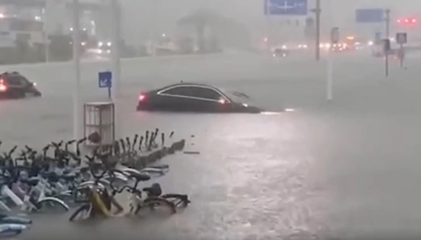 東莞市氣象台也在下午17時發布暴雨橙色和分鎮暴雨紅色預警信號,多個鎮街(園區)已發生內澇。現場大雨如注,道路積水嚴重,大水沒過小車車頭。