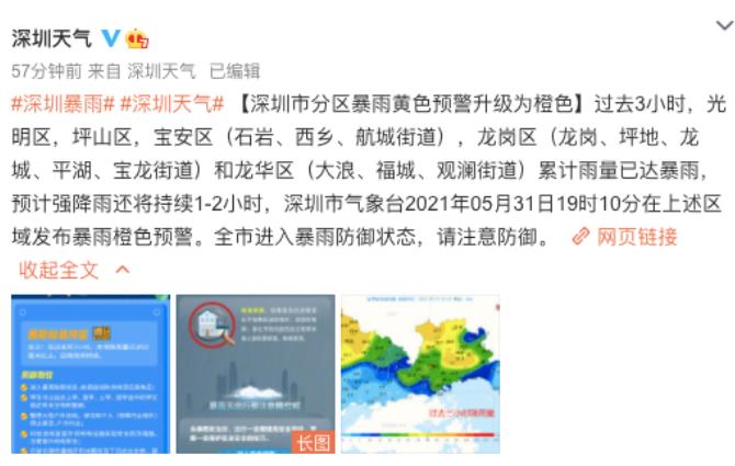 今天(31日)18時,深圳市氣象台發布全市黃色暴雨預警,到了19時10分,深圳天氣在微博發布消息稱:光明區,坪山區,寶安區(石岩、西鄉、航城街道),龍崗區(龍崗、坪地、龍城、平湖、寶龍街道)和龍華區(大浪、福城、觀瀾街道)累計雨量已達暴雨,預計強降雨還將持續1-2小時。與此同時深圳市氣象台在上述區域發布暴雨橙色預警。
