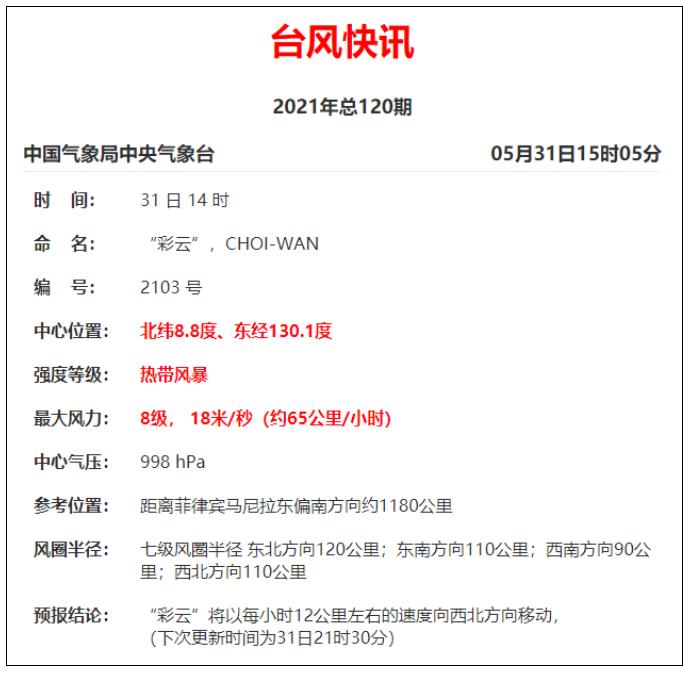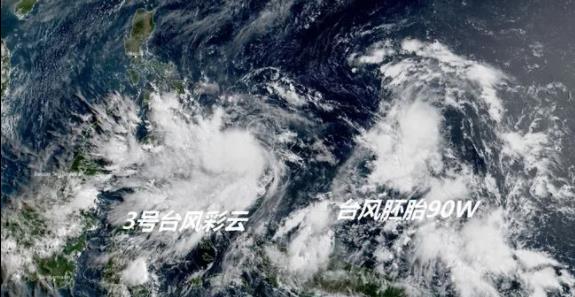 據中國天氣網消息,颱風胚胎99W於今天(5月31日)上午在菲律賓以東洋面生成,為今年第3號颱風「彩雲」。中心附近最大風力有8級(18米/秒),中心最低氣壓998百帕,七級風圈半徑90-120公里。