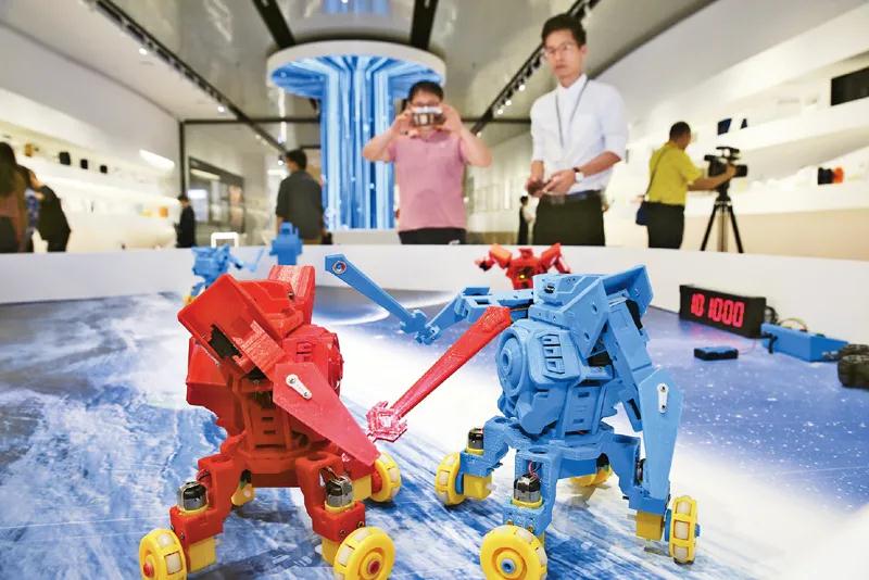 廣東堅持把創新發展作為大灣區建設的首要任務,強化三地科技設施聯通、科技要素暢通、創新鏈條融通,大力提升大灣區科技創新實力。圖為2021年4月19日,在廣東工業設計城創新科技館,工作人員在展示機械人「速斗無人區」。 新華社記者 殷剛/攝