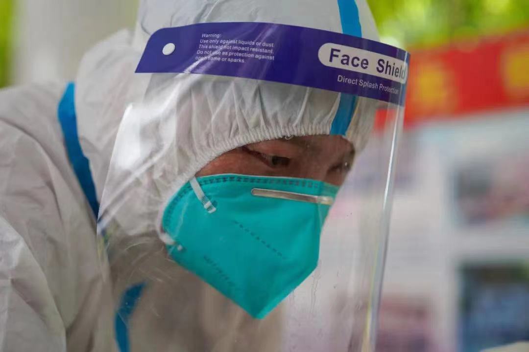 一位穿着防護服的醫護人員滿頭大汗,仍然堅守崗位。(越宣 供圖)