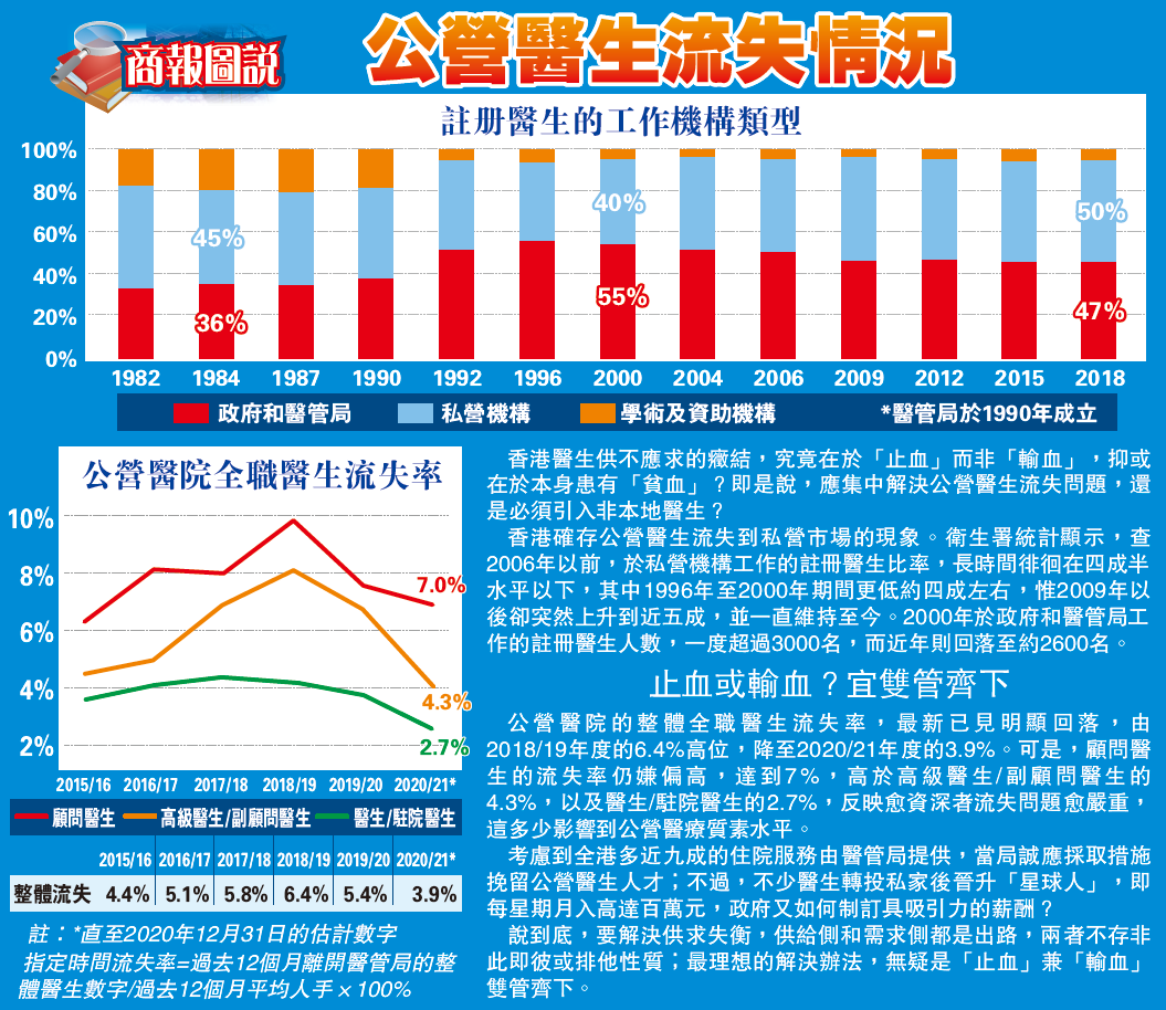 香港醫生供不應求的癥結,究竟在於「止血」而非「輸血」,抑或在於本身患有「貧血」?即是說,應集中解決公營醫生流失問題,還是必須引入非本地醫生?