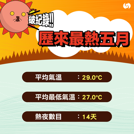 天文台總結五月天氣指,由於覆蓋華南的副熱帶高壓脊較正常強,上月是香港有紀錄以來最熱的五月,平均氣溫及平均最低氣溫分別為29.0度及27.0度,各較其正常值高2.7度及2.5度,兩者皆是有紀錄以來五月份的最高。