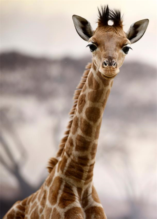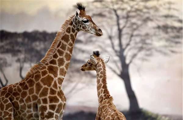 當地時間5月27日,在法國勒芒附近的弗萊什動物園,一隻19天大的長頸鹿寶寶站在成年長頸鹿旁邊。