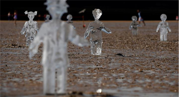 當地時間5月31日,在英國的布萊頓海灘,藝術組織「你眼中的沙」創作一尊尊冰雕小人,以強調 2021年聯合國氣候變化大會的重要性,該會議將於今年 11月在英國格拉斯哥舉行。