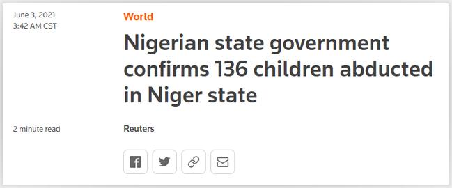 當地時間5月30日16時左右,一夥不明身份的武裝匪徒襲擊了尼日利亞尼日爾州拉菲地方政府區的一所學校。5月30日,尼日爾州州長阿布巴卡爾·貝洛發布聲明稱,被綁架學生中有11名年齡4至5歲的幼童因行走緩慢無法穿越叢林,被匪徒釋放。