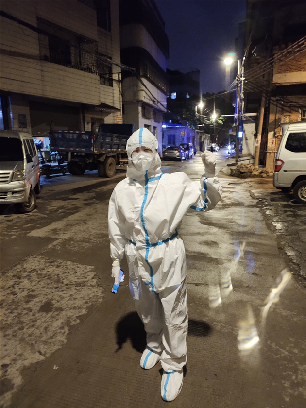 看着長長的核酸檢測隊伍,我身上的汗冒得更多了,長時間工作下,N95口罩勒得耳朵難受,眼罩也勒得腦袋轉不過來,手套也勒得雙手處於抽筋狀態……但是這些在當下我都無暇理會,掃碼——核對信息——幫錄入信息——掃試管——核對條形碼——提醒居民到指定位置排隊……一個又一個受測者,一棟又一棟樓地移動,全程站著協助核酸檢測工作有序開展。一個小時,兩個小時……四個小時過去了,由於長時間、高強度工作,居委工作人員安排住戶先回家等候,好讓工作人員能休息一下。休息間隙,很多同事手腳發麻穿着防護服直接躺倒在地,雖然疲憊不堪,但大家都心照不宣地為了防疫之戰而堅持到底。
