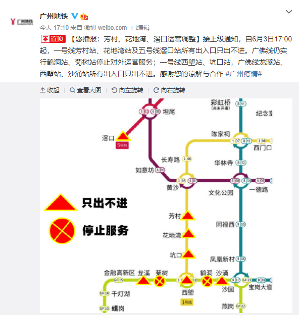 據廣州地鐵最新通報,「接上級通知,自6月3日17:00起,一號線芳村站、花地灣站及五號線滘口站所有出入口只出不進。廣佛線仍實行鶴洞站、菊樹站停止對外運營服務;一號線西塱站、坑口站,廣佛線龍溪站、西塱站、沙涌站所有出入口只出不進。」